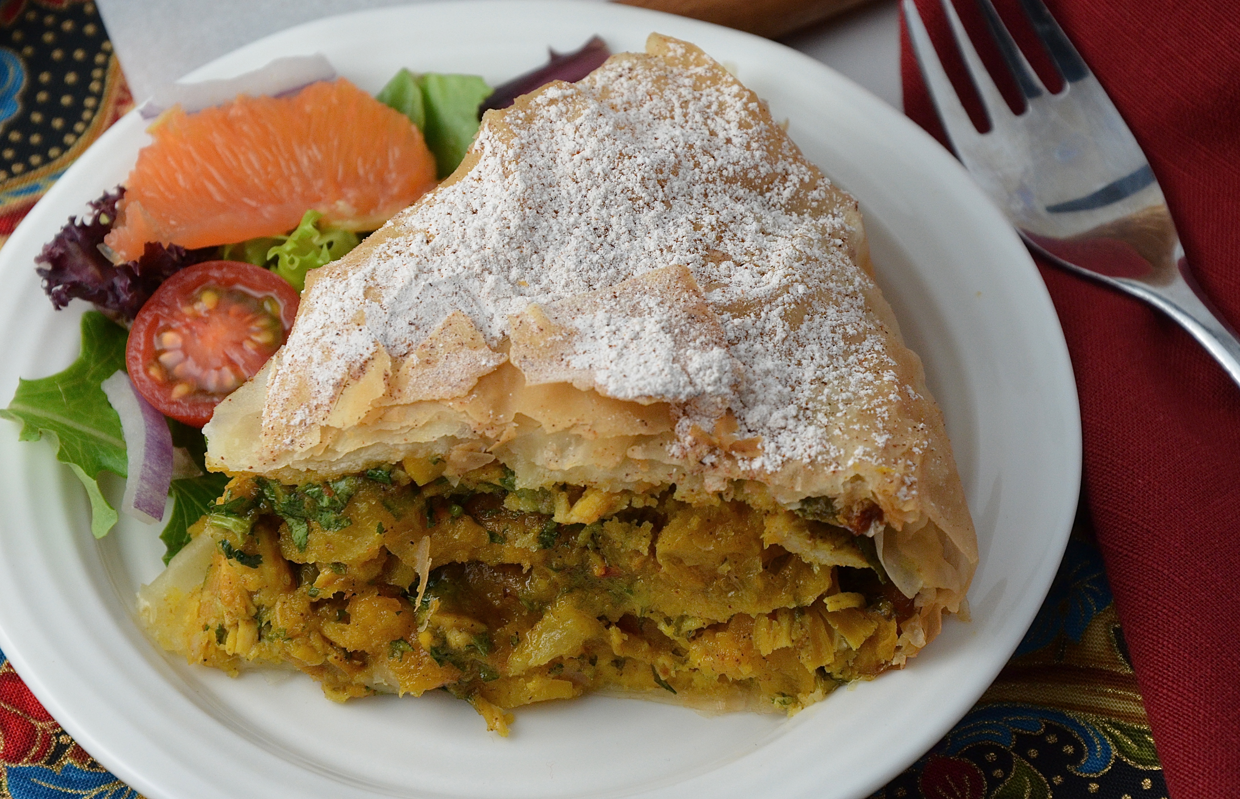 Moroccan Chicken Pie with Apricots and Almonds (B'Stilla)
