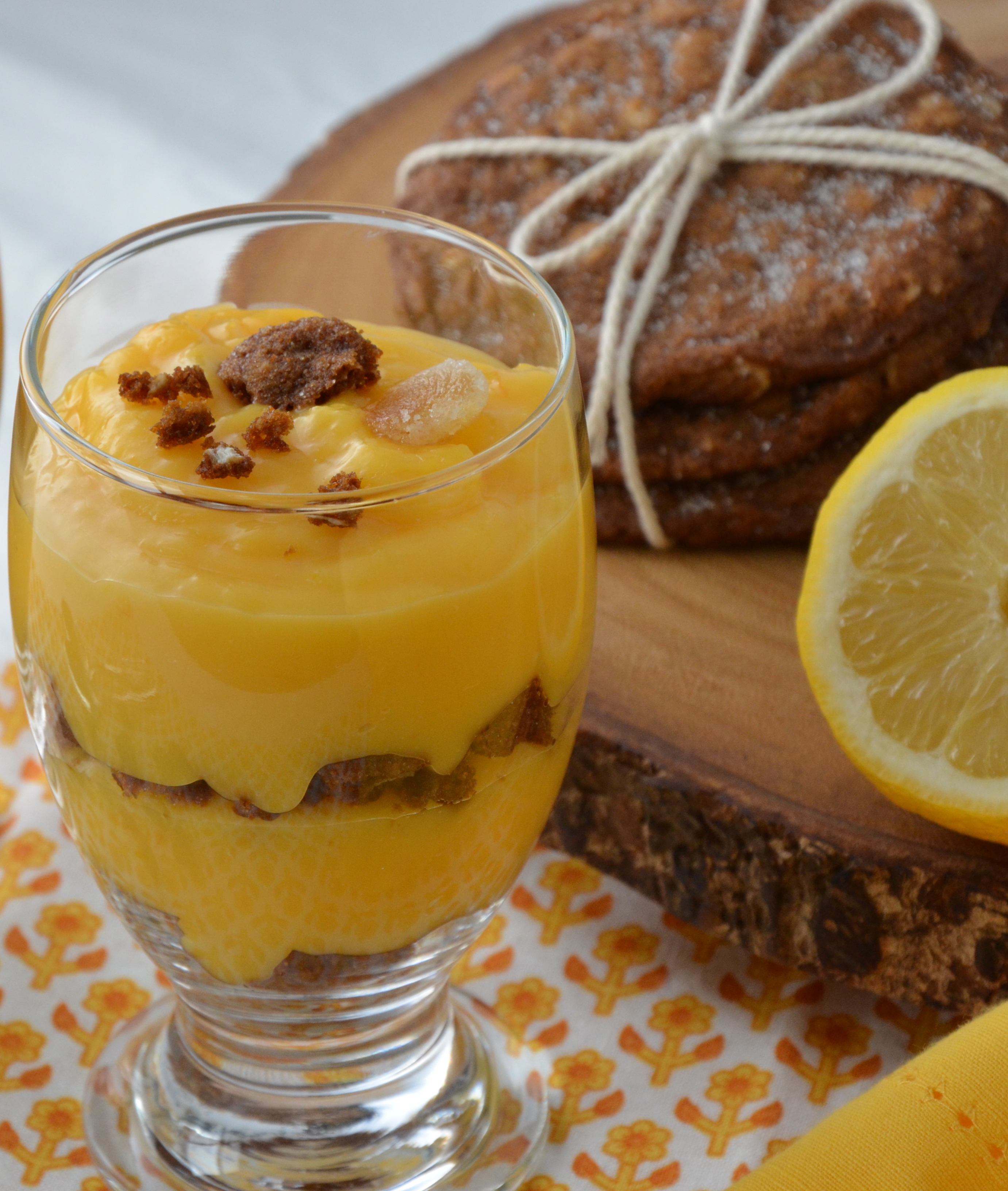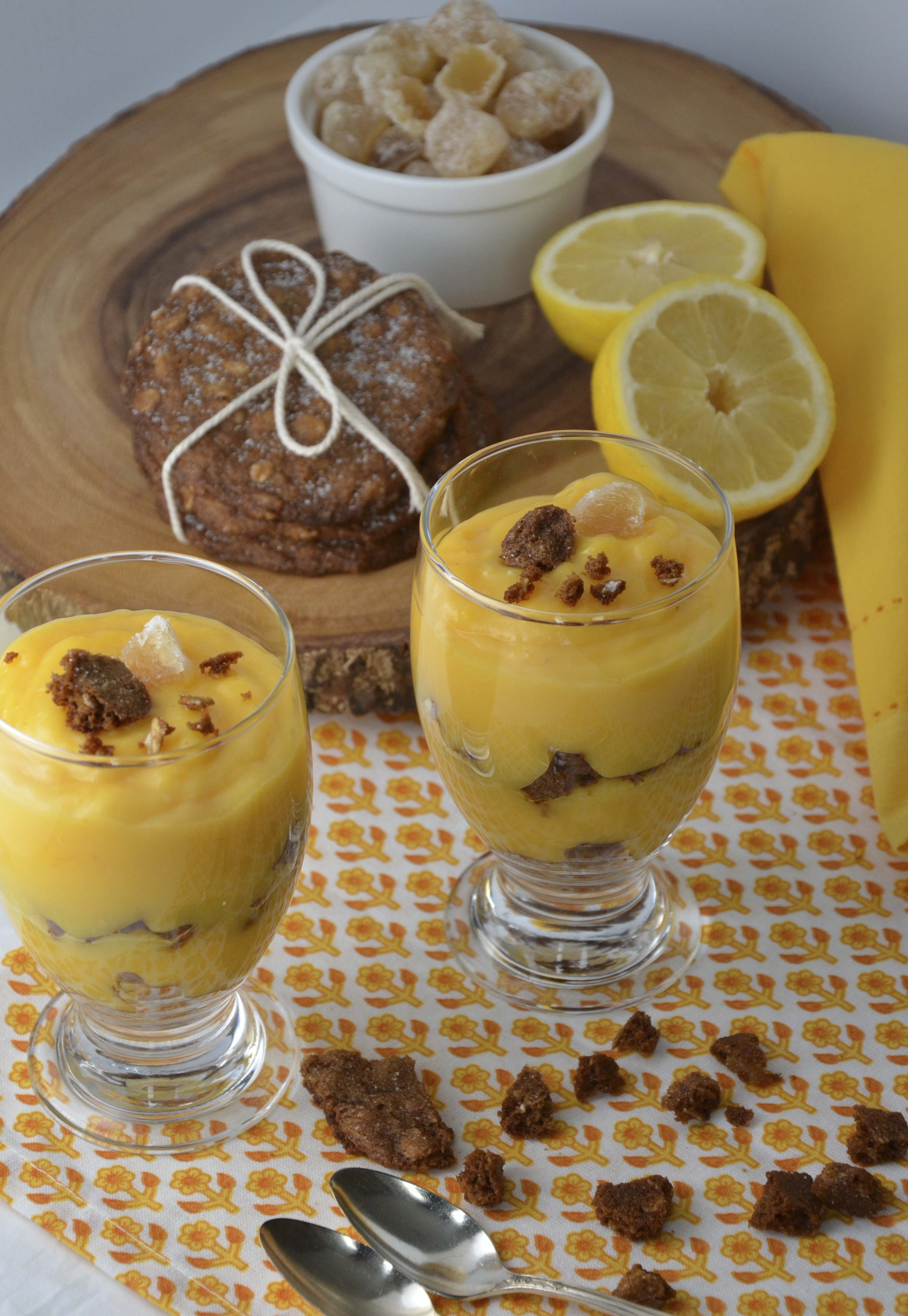 Make as many layers as you like, ending with the lemon curd. Garnish with a few cookie crumbles and a chunk of candied ginger.