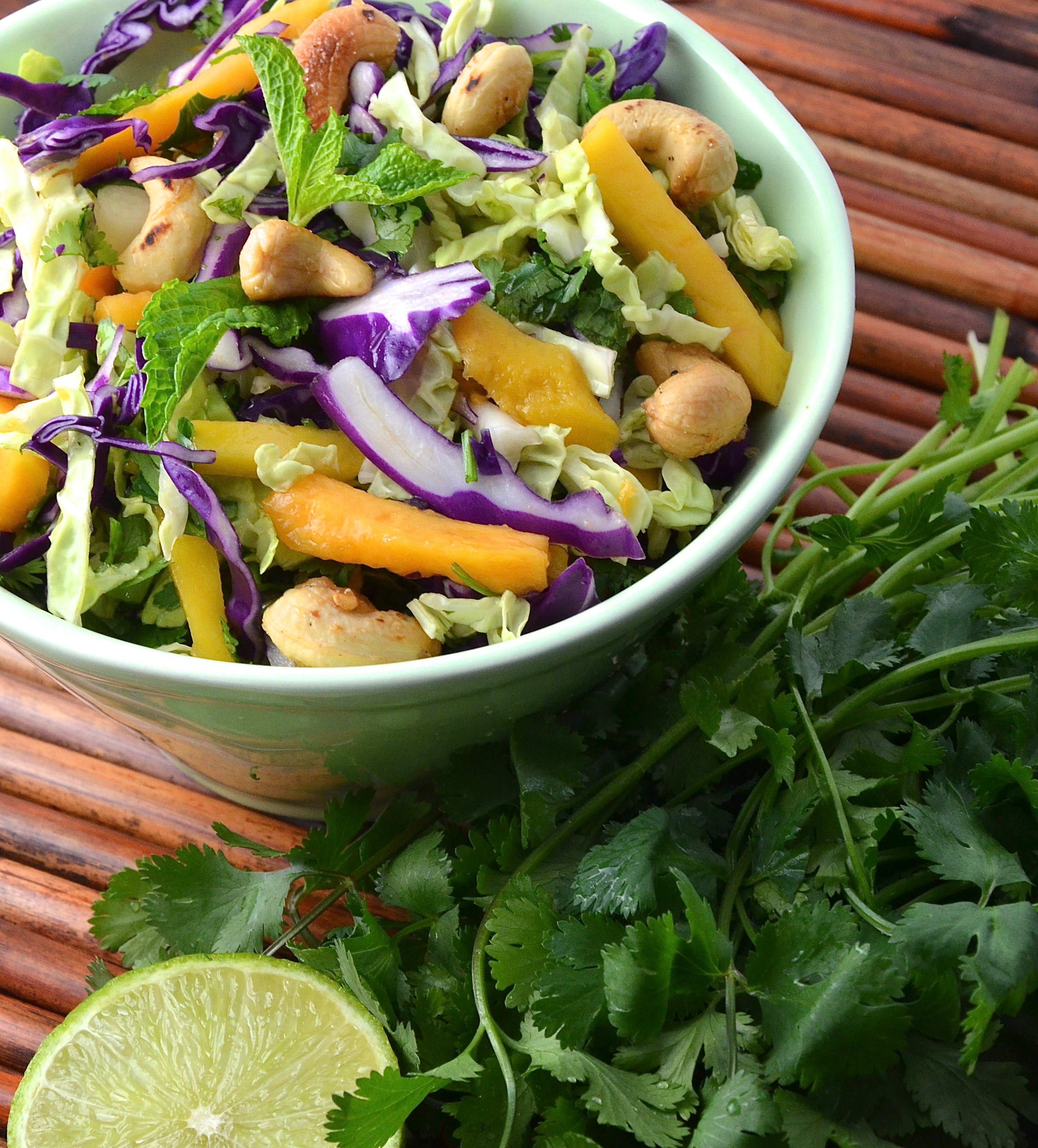 Cole Slaw: everybody loves it, right? I had originally intended to feature 3 delicious variations of slaw in this post, but this recipe is such a show-stopper, I thought it deserved its own post. Once again, I am cooking from one of my very favourite cookbooks, “Plenty” by Yotam Ottolenghi. By now you might have guessed that I love this cookbook! This recipe is made stunning by the spicy Asian dressing and the addition of two tropical fruits, mango and papaya. The original recipe called for macadamia nuts, but I used cashews instead. Mint and cilantro leaves make the recipe scream summer! Serve it up with your favourite burgers or kebabs, and a frosty mojito on the side and your soul will be screaming summer too!