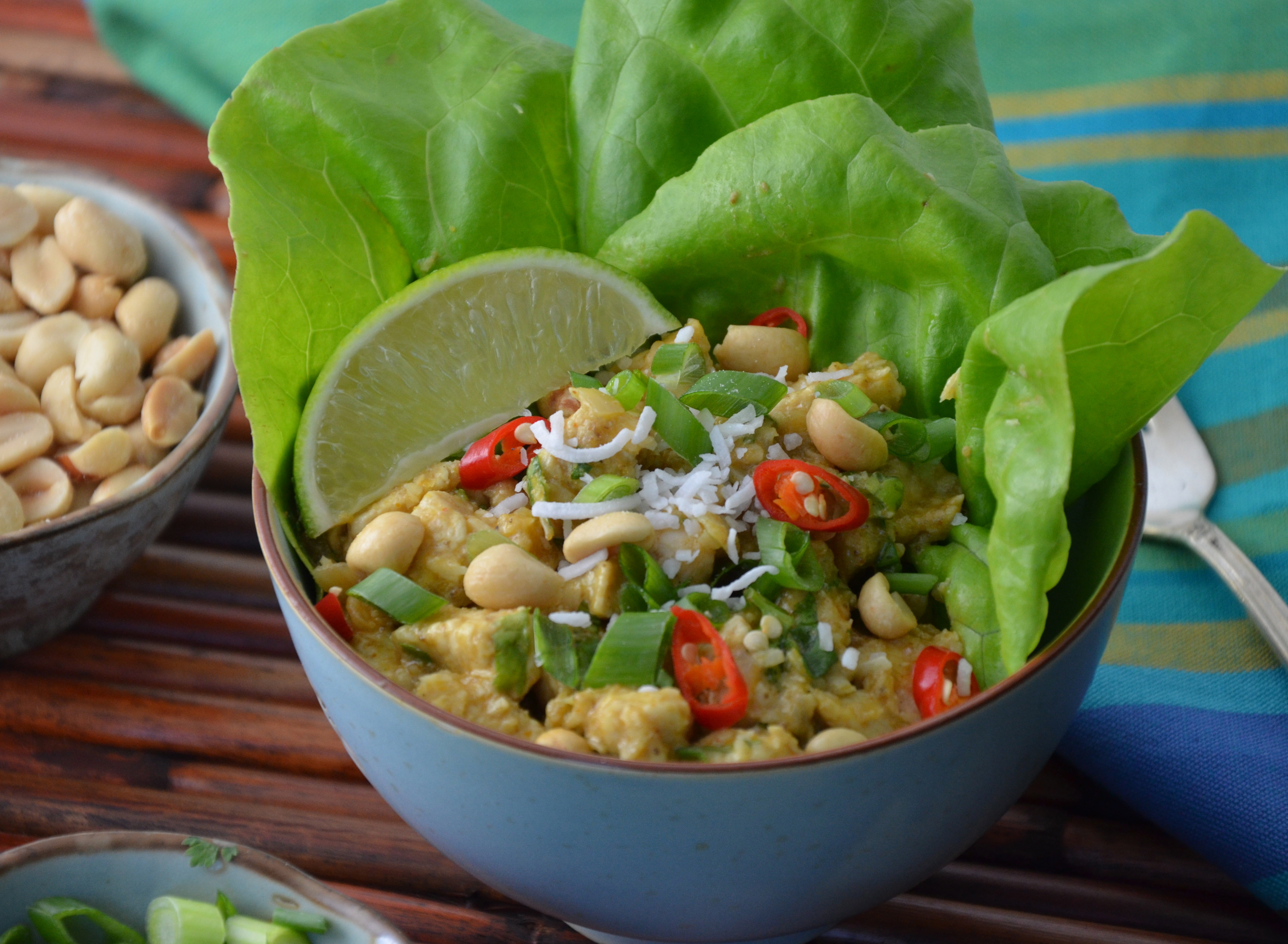 Love the coconut curry chicken. I like the idea of using lettuce leaves to serve.