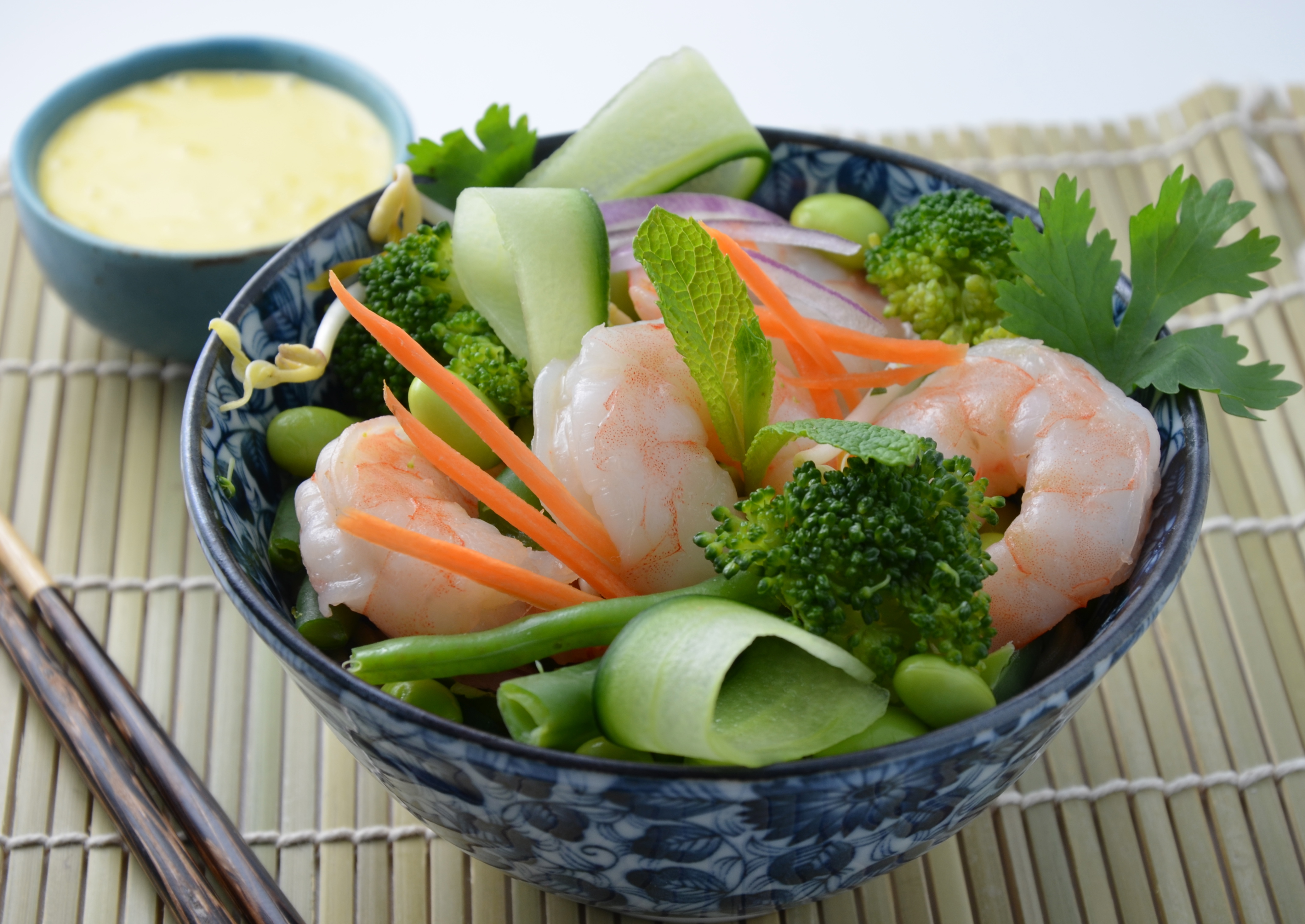 Add the prawns, noodles, broccoli and green beans to the salad. Pour over your desired amount of dressing and toss well to combine.