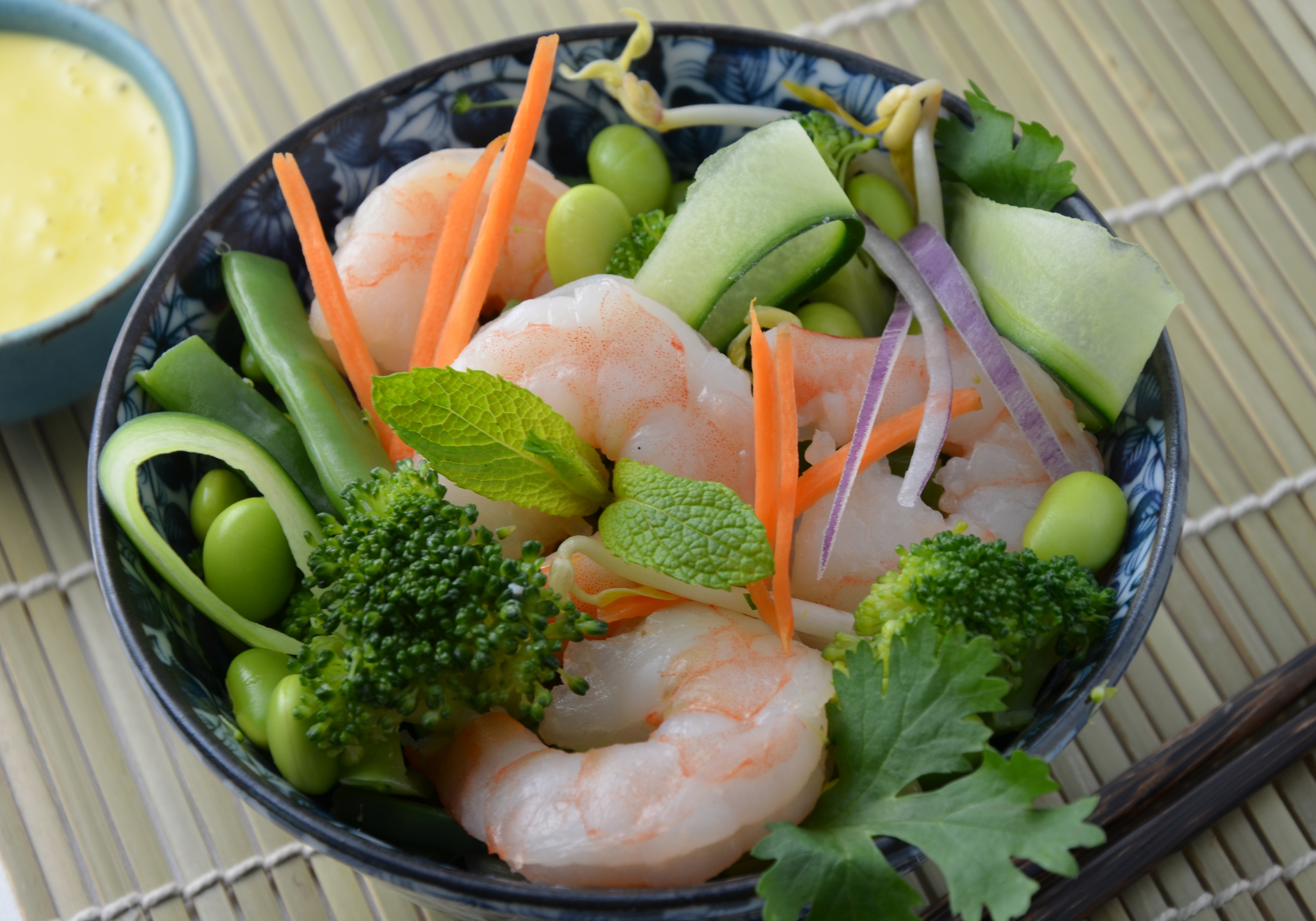 Combine the carrot and cucumber in a large bowl or serving platter. Add the bean sprouts, edamame beans, green onions, red onions, mint and cilantro.