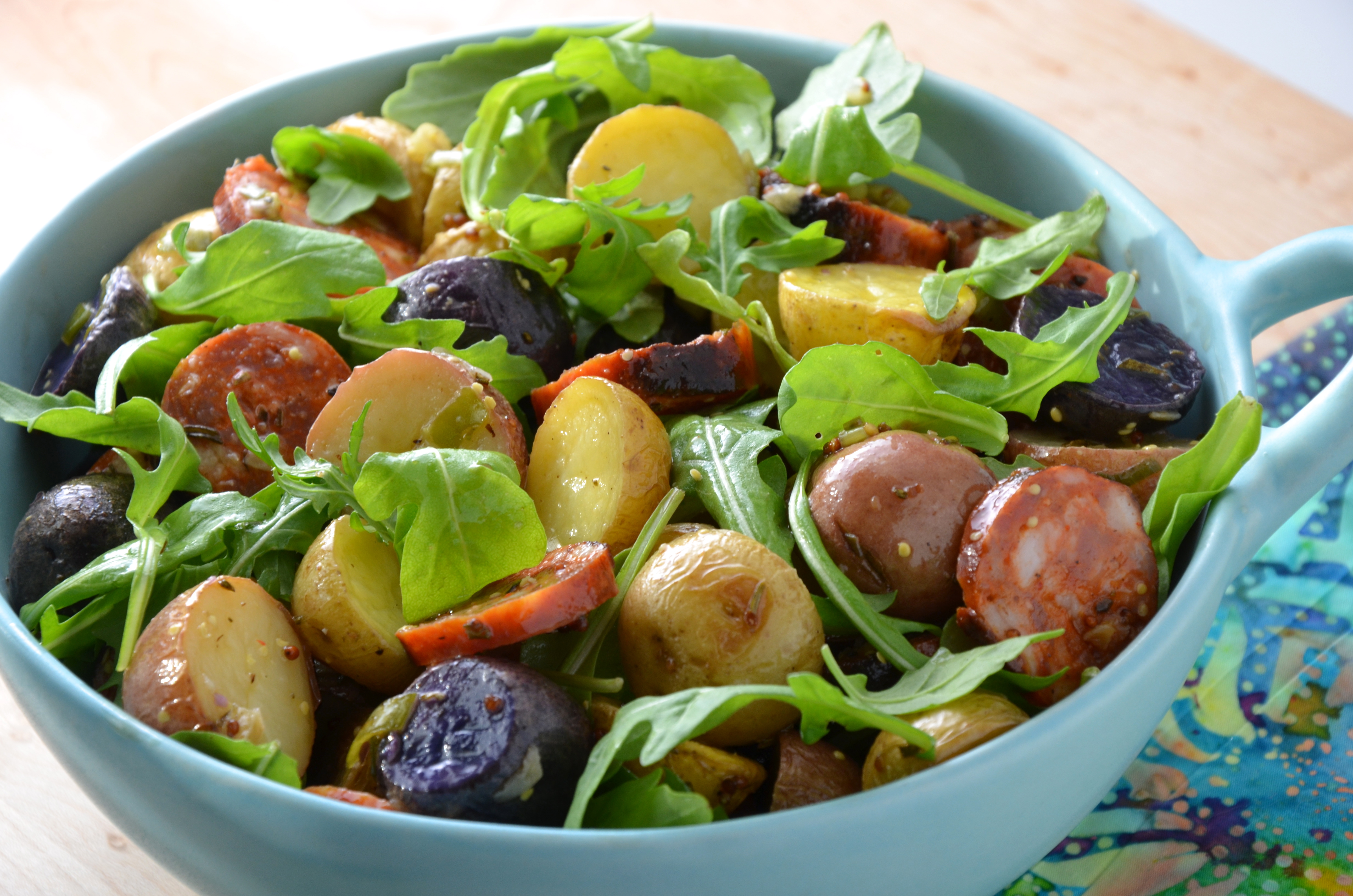 In a large bowl, whisk together the ingredients for the dressing. Add the warm potatoes and sausage. Toss in the arugula. Serve immediately.