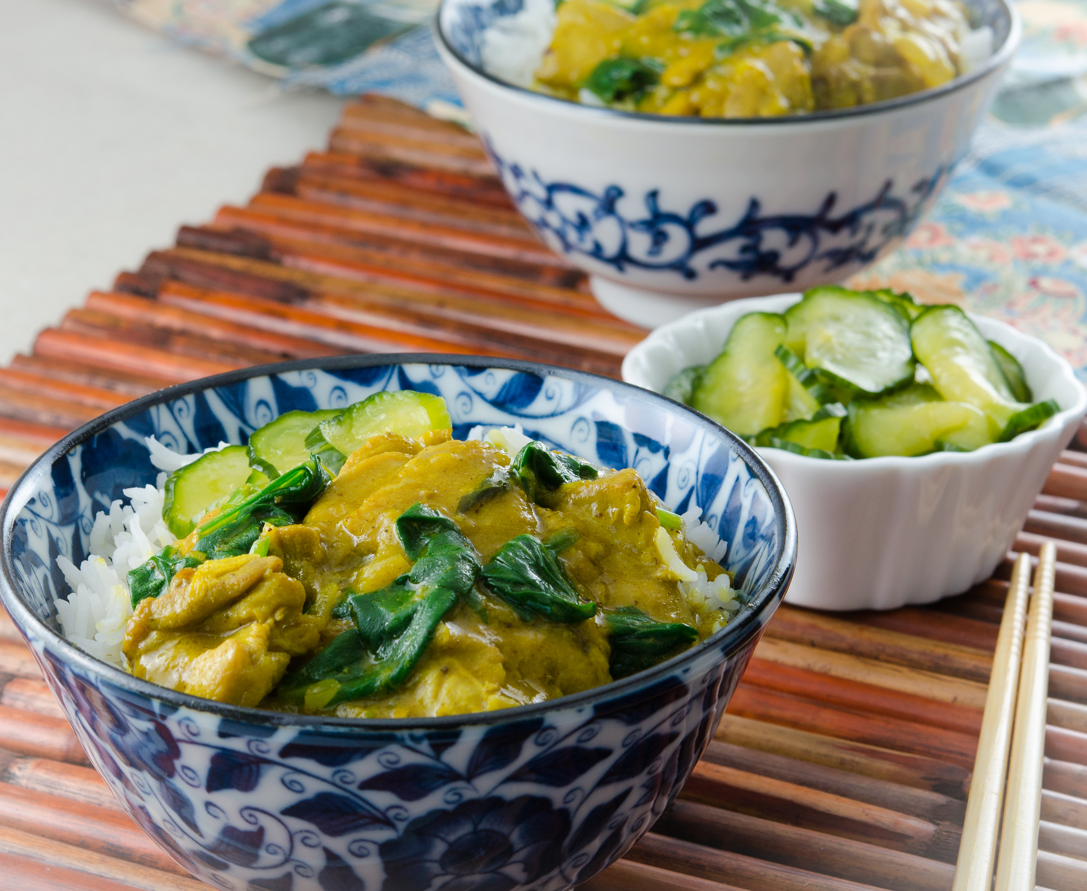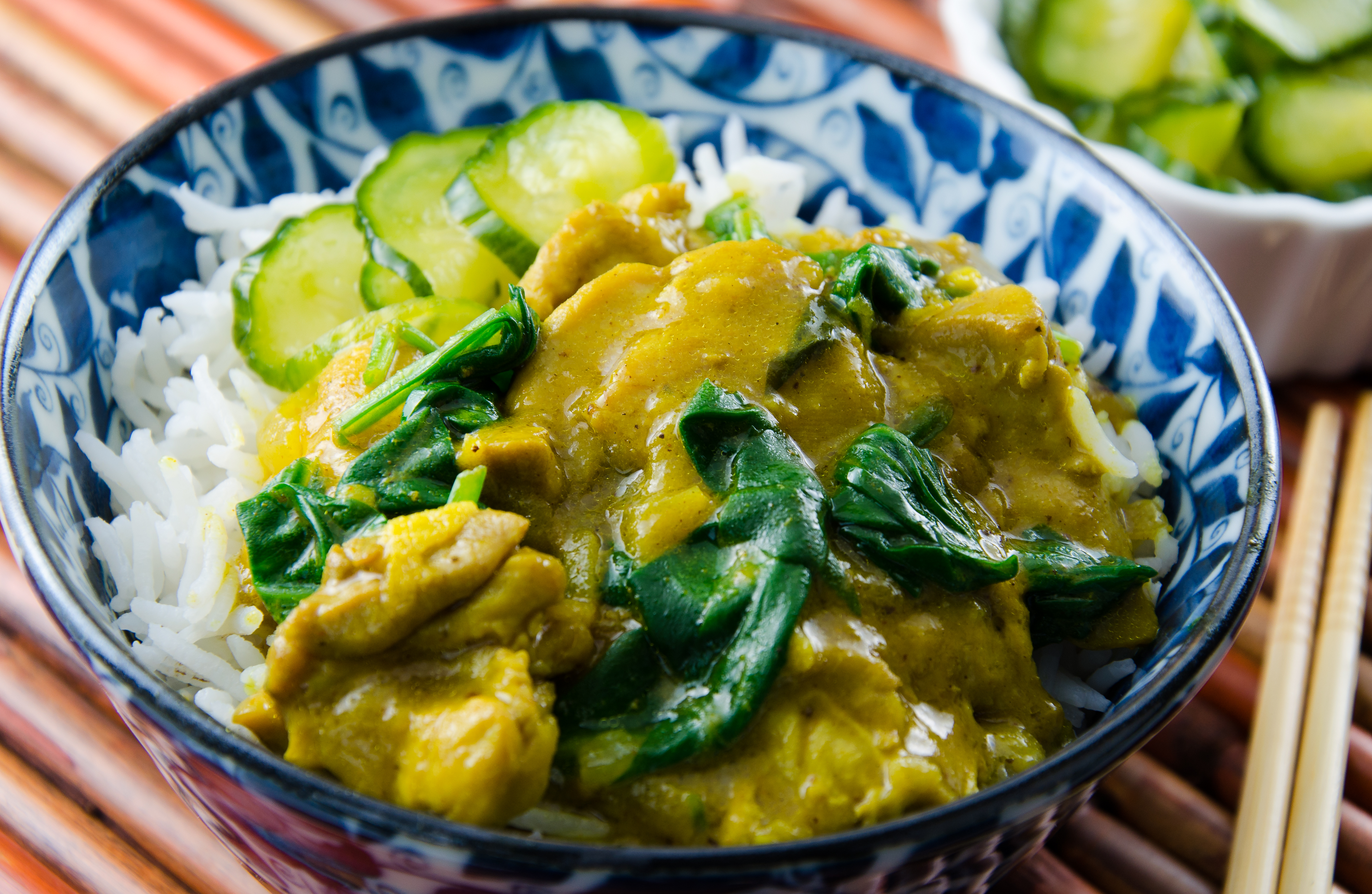 Parece que el olor del curry nos llega mirando la foto, la receta tiene un aspecto estupendo y el encurtido de pepinos me parece muy fácil de hacer y probaré alguno de estos días.