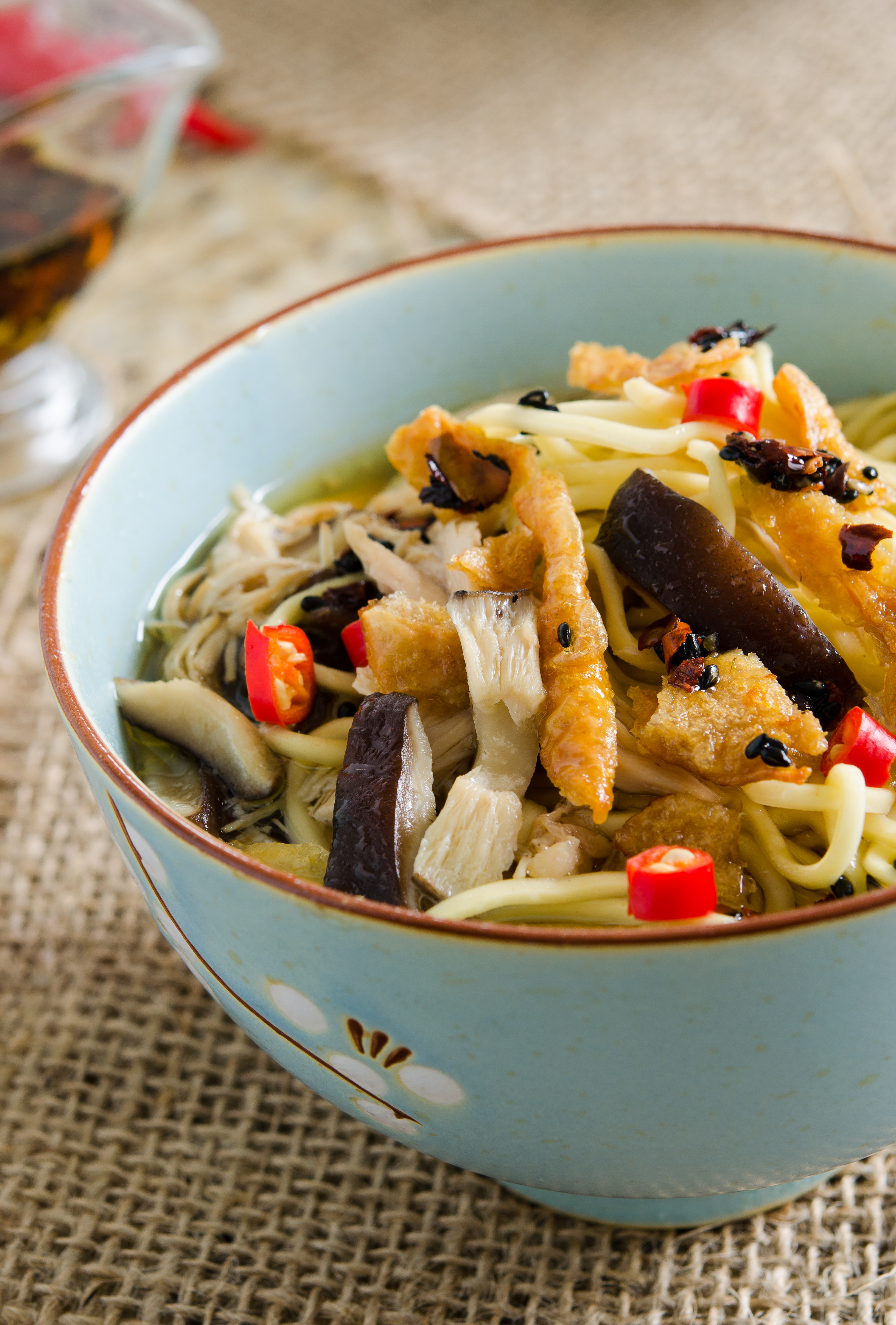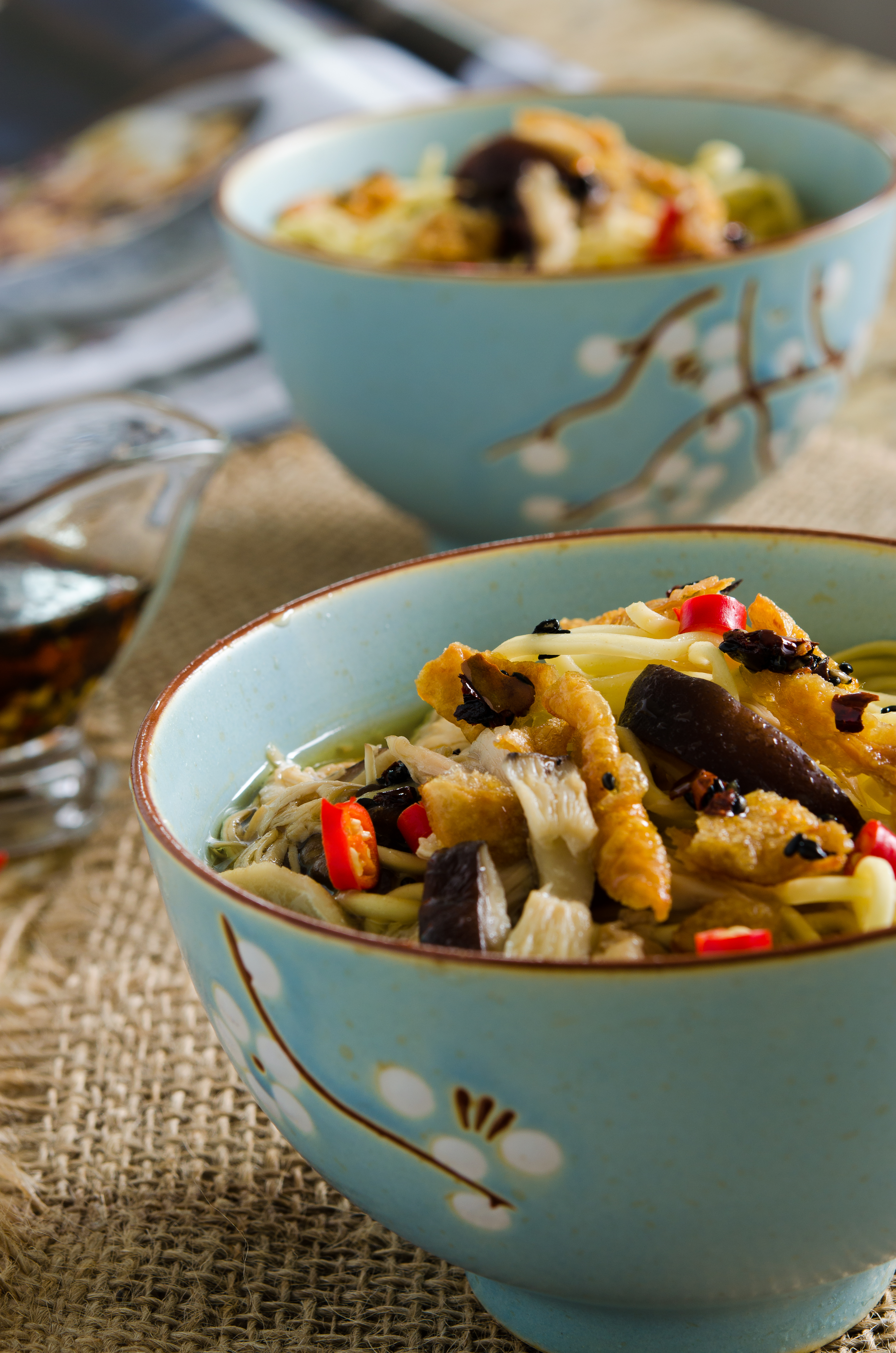 Divide the noodles between the bowls. Add the soup to the bowls and top with the crispy chicken skin. Drizzle with the chile sesame oil.