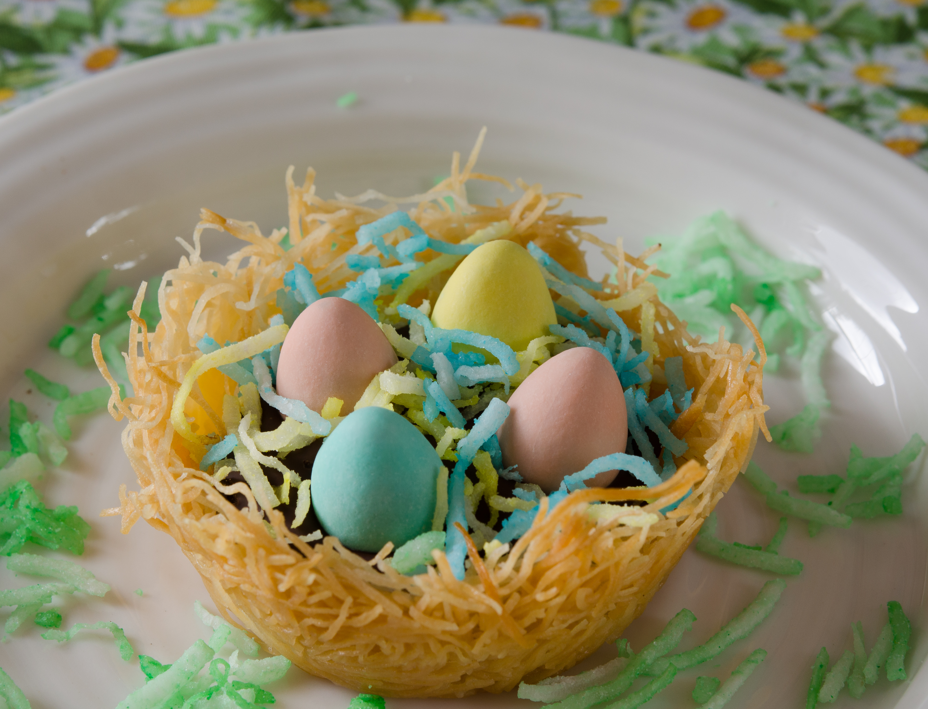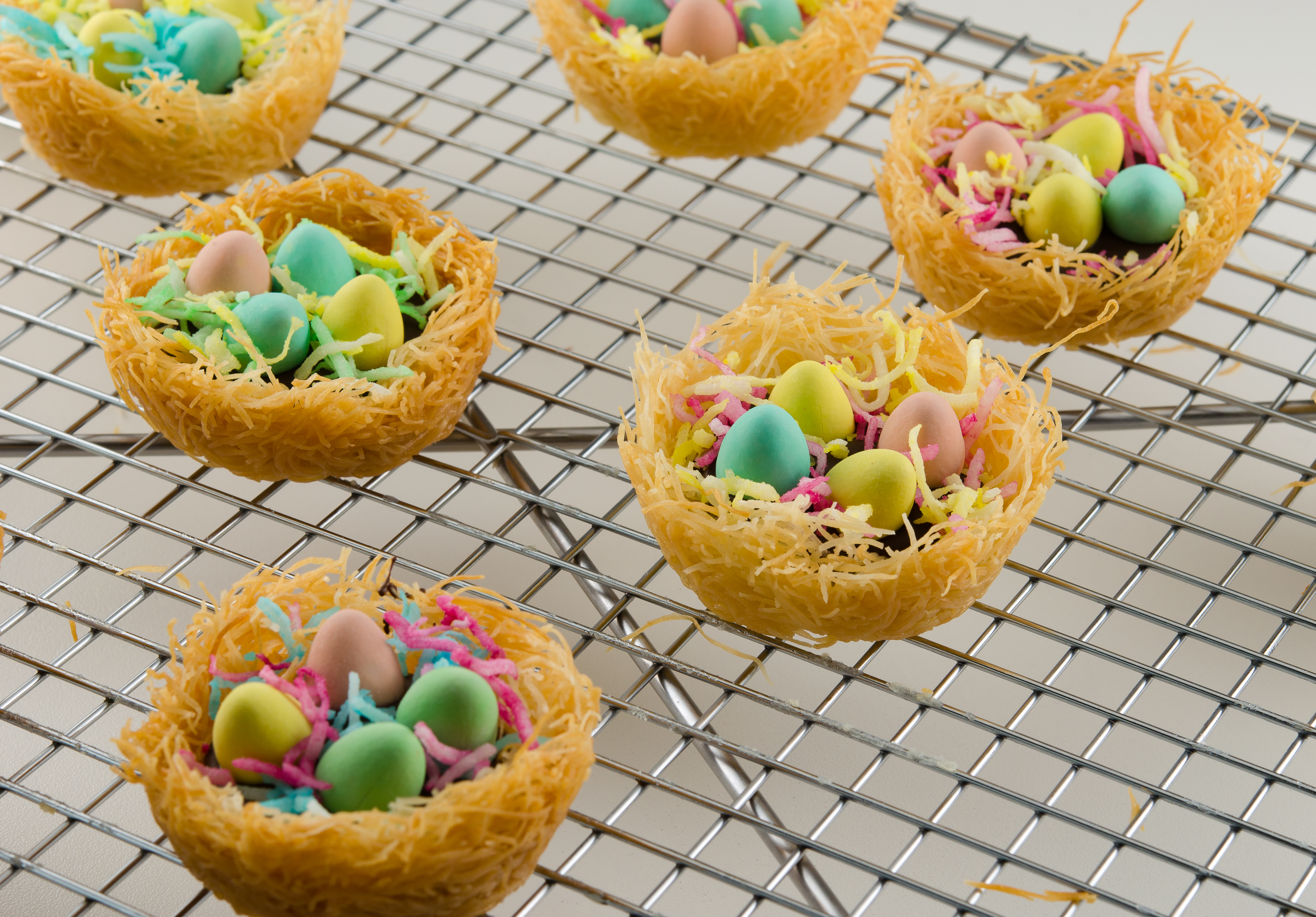 Gasp! I’m here putting the finishing touches to our FF63 and who but my reliable co-host arriving super early! With these adorable Easter nests! So making these, even though it’s after Easter. I have kataifi left over from another project! Thanks, Julianna! 🙂