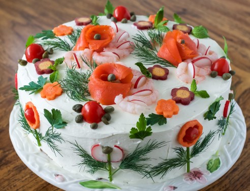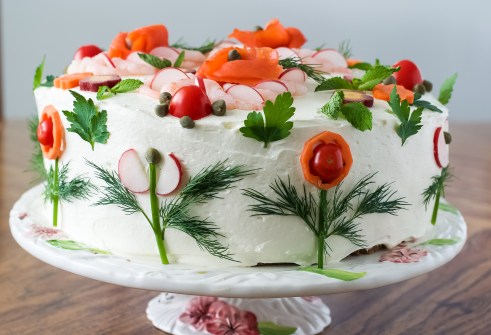 Spread the frosting on the cake and decorate it as you desire. I made rosettes with slices of smoked salmon.  You could make rosettes from slices of salami or other cold meats. Punch out shapes in sliced carrots.   Use lots of fresh herbs.  Let your inner artist go crazy!