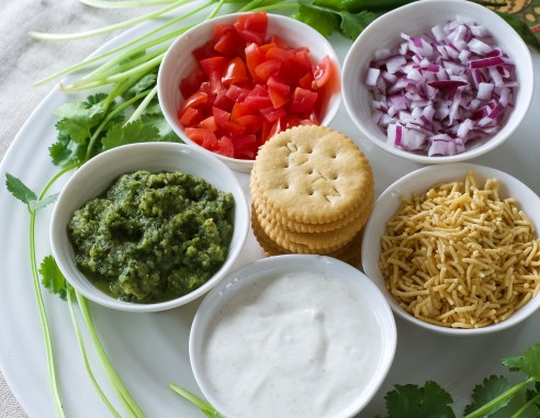 Arrange all the little serving bowls on a platter with the crackers. The guests can construct their own crackers by placing a small dollop of the yogurt on the cracker first, followed by a few minced onions and tomatoes. Top with a small dollop of the chutney, and finally garnish with the sev and a bit of cilantro. If you like it extra spicy, dot with a bit of sriracha.